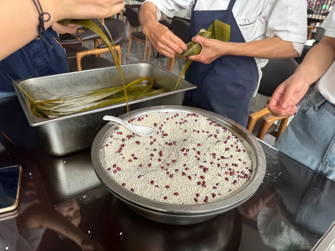 活動現場,糯米、粽葉等食材有序地排列開來,大家齊聚一堂,捋粽葉、填糯米、封口、扎捆,忙得不亦樂乎。不一會兒,一個個形態各異的粽子就擺滿了桌面,凝聚著黨員們滿滿的心意