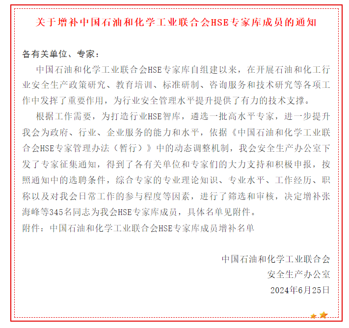 近日,“中國石化聯(lián)合會(huì)安全生產(chǎn)辦公室”正式發(fā)布《關(guān)于增補(bǔ)中國石油和化學(xué)工業(yè)聯(lián)合會(huì)HSE專家?guī)斐蓡T的通知》,我公司黨支部委員、總法律顧問、工會(huì)主席張明同志憑借其深厚的專業(yè)知識和豐富的實(shí)踐經(jīng)驗(yàn)成功入選“中國石油和化學(xué)工業(yè)聯(lián)合會(huì)”HSE專家?guī)臁?/span>