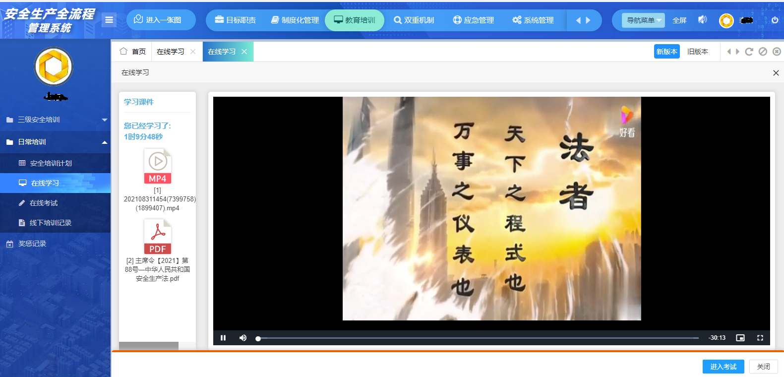 麗天碼頭利用“五位一體”系統(tǒng)組織全員進(jìn)行線上培訓(xùn),線上培訓(xùn)分為視頻觀看、新《安全生產(chǎn)法》內(nèi)容學(xué)習(xí)和線上考核三部分,截止目前,已有90%員工完成了線上培訓(xùn)和考試。